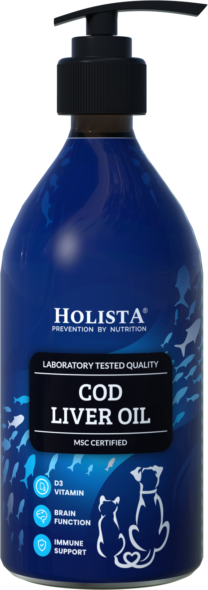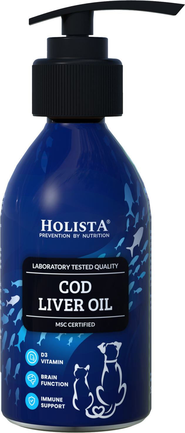 Holista Cod Liver Oil is made from fresh cod livers (Gadus morhua) caught in the pristine waters around Iceland. This product is free from genetically modified materials and ingredients and rich in EPA and DHA fatty acids, as well as vitamins A and D. Dogs and cats cannot naturally produce essential omega-3 fatty acids in their bodies, so it’s crucial to ensure our pets receive these fatty acids through high-quality supplements. Long-chain omega-3 fatty acids EPA and DHA support the health of the heart, kidneys, liver, joints, brain, and eyes.