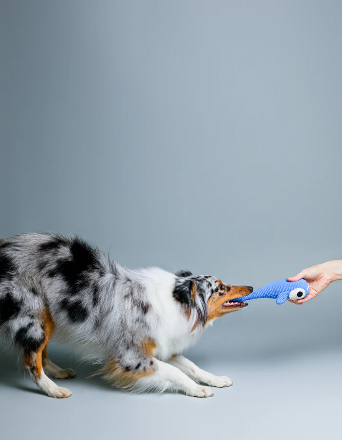 • Organic whale-shaped dog toy named Bazyl for hours of fun and play